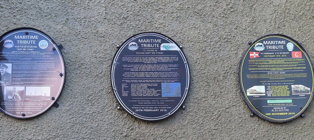 The other plaques commemorate the SS Upas (Irish Wrecks); the Quo Vadis fishing boats (Mourne Maritime); SS Orior (Wrecksite); the “merchant seamen from Newry And Mourne who served with courage and valour through both World Wars”; SS Clew Bay, which took part in Operation Dynamo in Dunkirk; SS Dingle; the “Carlingford Lough Disaster” in 1916 – the collision of the SS Connemara and SS Retriever with the loss of 94 lives (BBC).