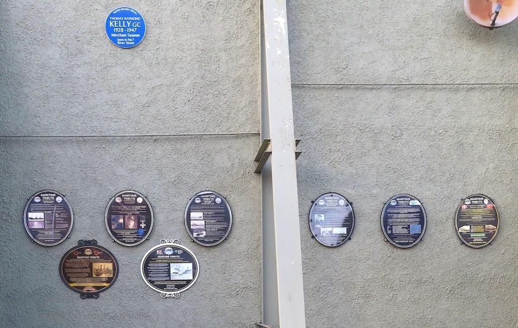 The middle of the three upper plaques in the image above, as well as the blue plaque above them (in the third image), is dedicated to Thomas Raymond Kelly, a merchant seaman who died as he attempted to rescue a third person from heavy seas in the Bay Of Biscay. He was awarded the George Cross for his efforts (Newry Maritime Association).