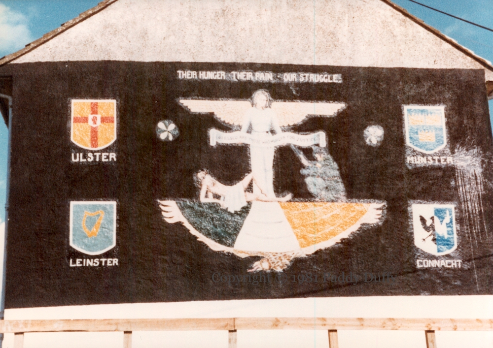 This Whiterock Road mural shows a blanketman/hunger-striker being watched over by a uniformed volunteer, on a large tricoloured bunting/drape at the feet of an angel holding a banner reading “blessed are those who hunger for justice“. Above are the words “Their hunger, their pain, our struggle“. The shields of the four provinces of Ireland and two shamrocks complete the mural.