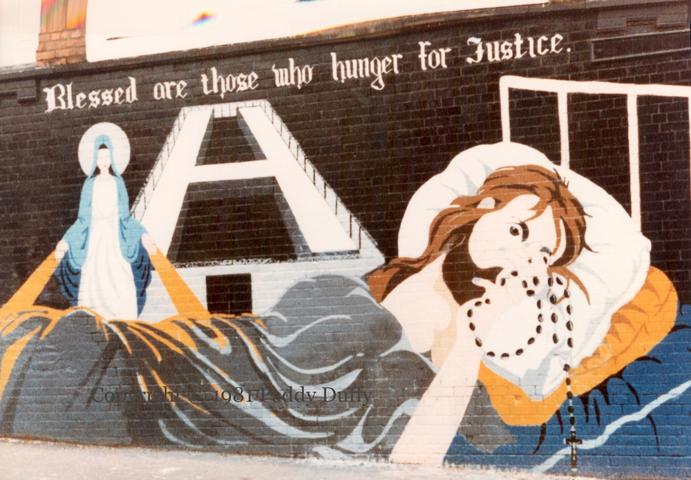 (Painted by Con, who describes the mural as an attempt to break through with nationalists (as distinct from republicans); though one source says “by a Ballymurphy man, named something like Tim Skillen/Skelly”.)