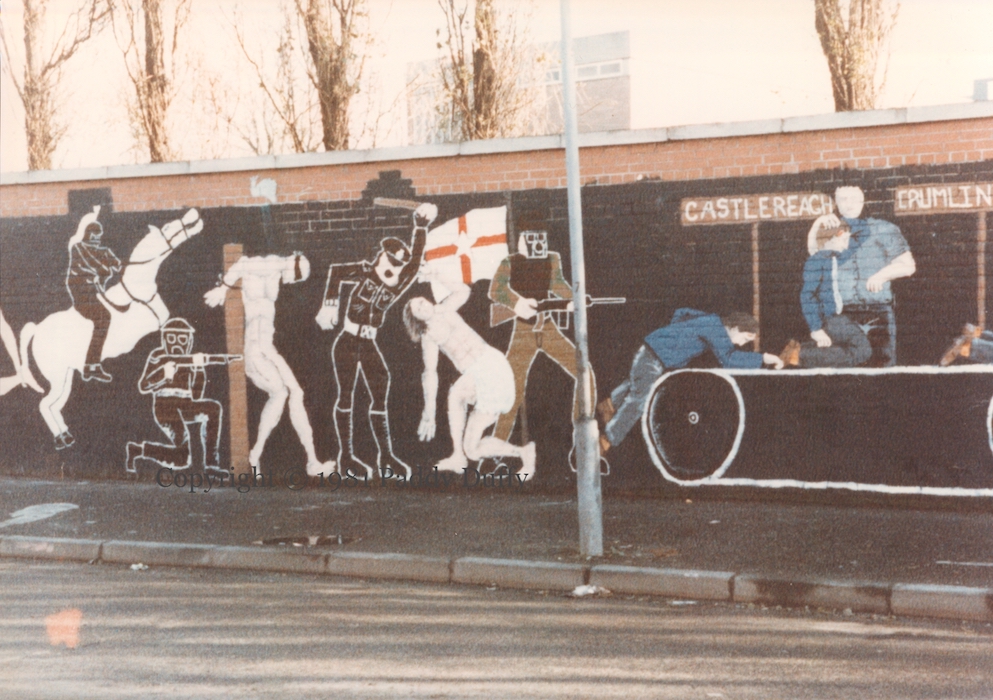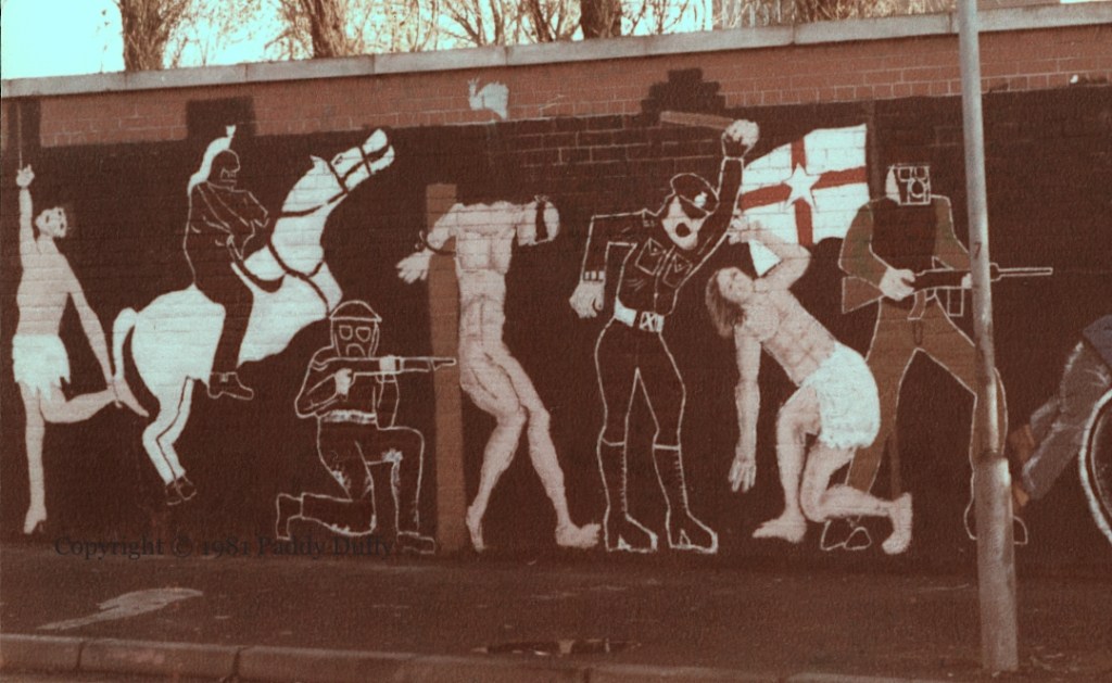 Jeff Perks’s 1979 linotype “The Training Ground” was reproduced on Beechmount Avenue in 1981. It depicts the history of the British Army in Ireland. Rolston (“Politics, Painting and Popular Culture: the Political Wall Murals of Northern Ireland”, Media, Culture and Society 9.1, 1987) claims (p. 19) that the image would have been familiar to nationalists from the cover of “Ireland: Voices For Withdrawal” (shown below). The baton-wielding policeman on the right was also reproduced in a famous 1996 Derry mural (“68-96 Nothing Has Changed” M01279).