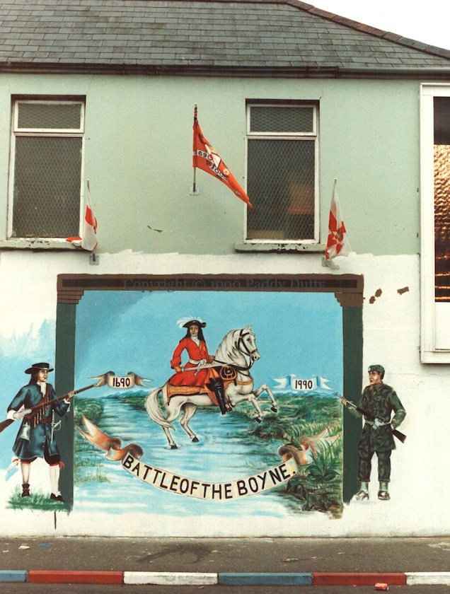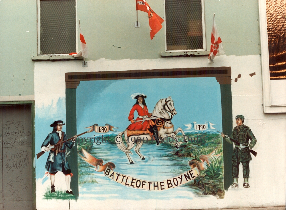 King William III is flanked by foot soldiers from 1690 and 1990. A small painted sign to the right reads, “We the people of Sandy Row remember with pride the 300th anniversary of the Battle of the Boyne. No surrender. Signed, UFF.”