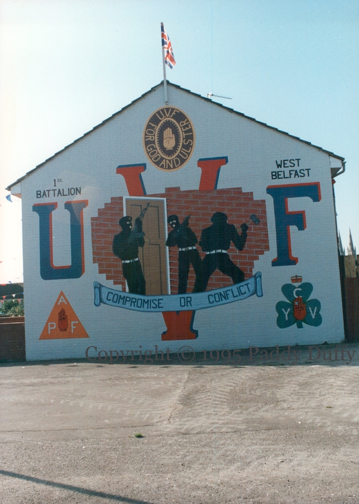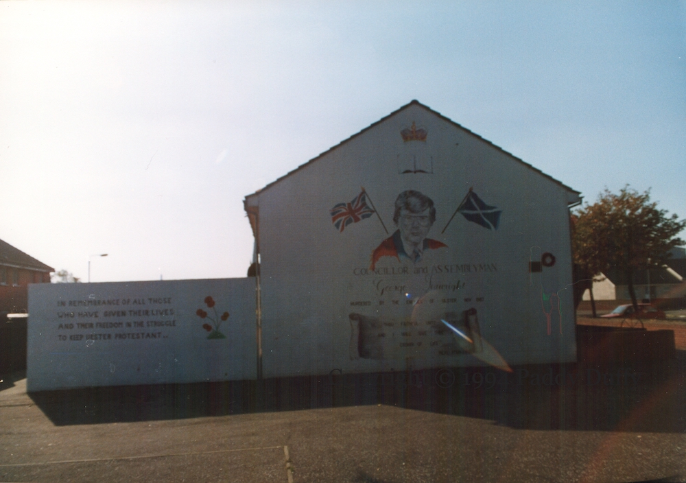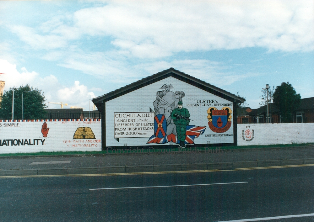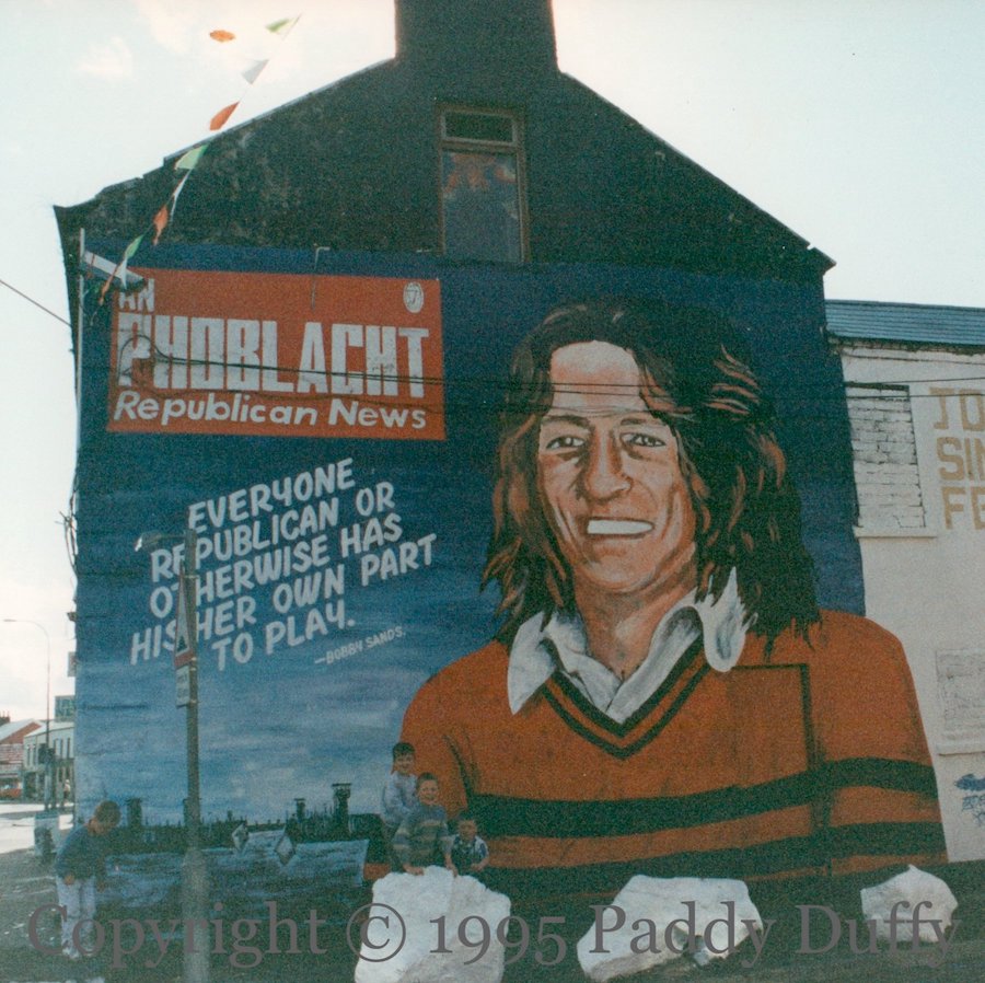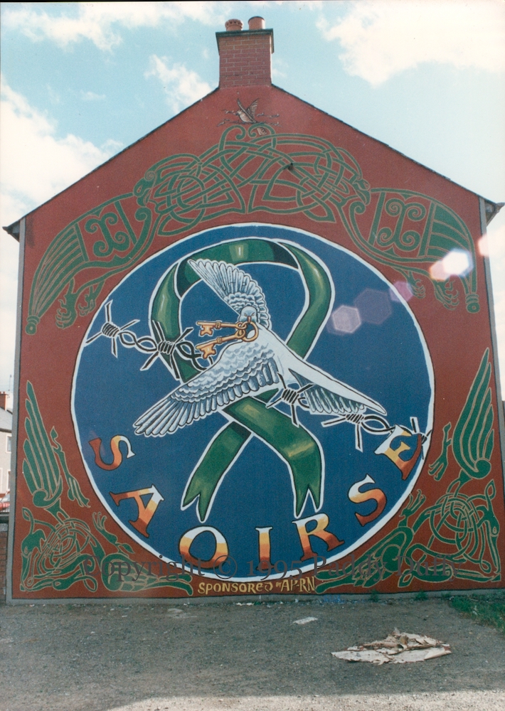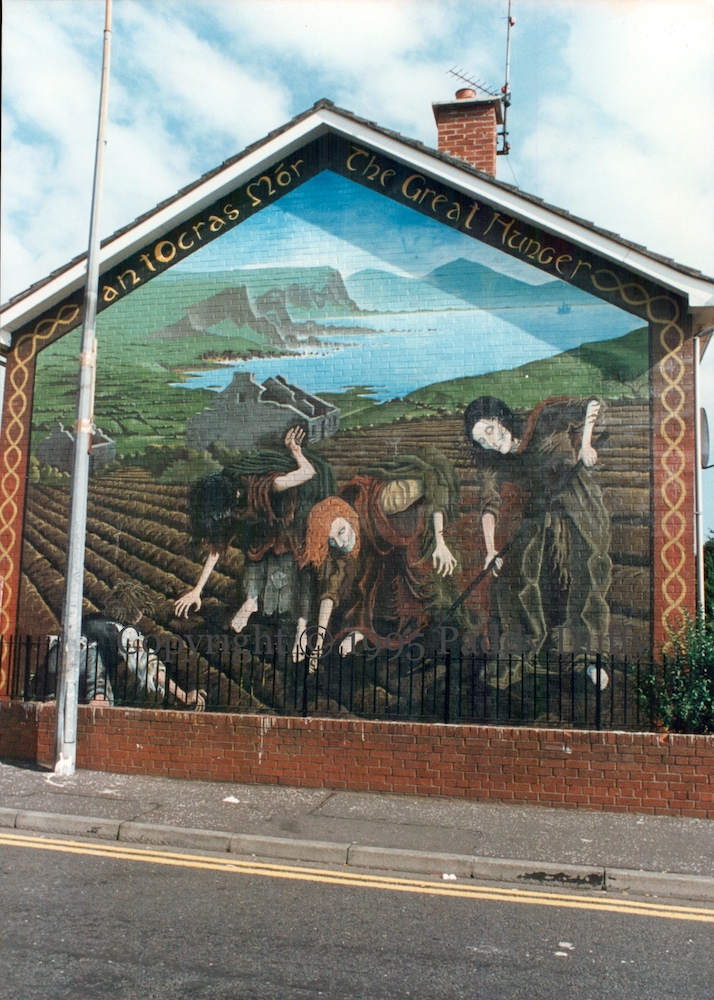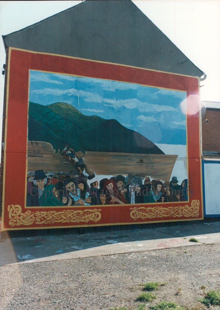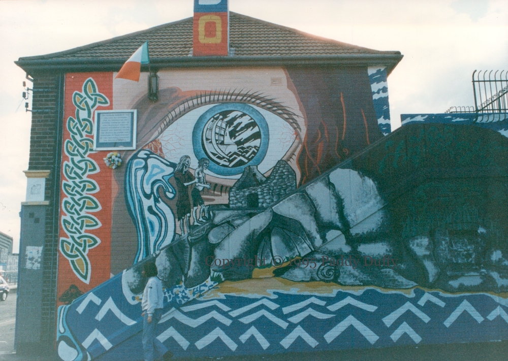 1993-1995 1993 The Irish Holocaust — Springfield Rd, Belfast 1994 Carousel The Blind Piper NBCS —Brompton Pk, Belfast Gaelic Games — Havana Way, Belfast Slán Abhaile — Ardoyne Ave, Belfast Foundation Stones — Falls Rd/Fallswater St, Belfast Your Ship Awaits — Rossnareen Pk, Belfast Alosa – Fuiseog — Rossnareen Ave, Belfast 25 Years Of Resistance — Dunville St, Belfast George Seawright — Percy Pl, Belfast 1995 Carousel Gorta Mór — Lenadoon Ave, Belfast Gorta Mór —Rossnareen Pk, Belfast Gorta Mór — Slemish Way, Belfast No Plastic Bullets — Whiterock Rd, Belfast Time For Peace, Time To Go — Whiterock Rd, Belfast Fág Ár Sráideanna — Whiterock Rd, Belfast Statue Of Liberty — Dunville St, Belfast Saoirse Keys — Donegall Rd, Belfast Weary People What Reap Ye? — Donegall Rd, Belfast Children Of Lear — Rockville St, Belfast Emigration — Oakman St, Belfast An Gorta Mór — Falls Rd/Fallswater St, Belfast Bobby Sand (blue) — Sevastopol St, Belfast Stevie McCrea — Hopewell Cr, Belfast Simply The Best — Dover Pl, Belfast Compromise Or Conflict — Dover Pl, Belfast McMichael Roll Of Honour — Rowland Way, Belfast UFF Only Crime — Newtownards Rd, Belfast Past Defenders — Newtownards Rd, Belfast Ancient Defender —Newtownards Rd, Belfast Young Newton —Newtownards Rd, Belfast Prepared For Peace —Mt Vernon Rd, Belfast Ériu — Brompton Pk, Belfast Saoirse Keyhole —Donore Cr, Belfast An tOcras Mór — New Lodge Rd, Belfast Battle Of The Bogside 25th —Lecky Rd, Derry The Petrol Bomber —Lecky Rd, Derry Screw — Brook St, Derry Free Derry Corner — Lecky Rd, Derry