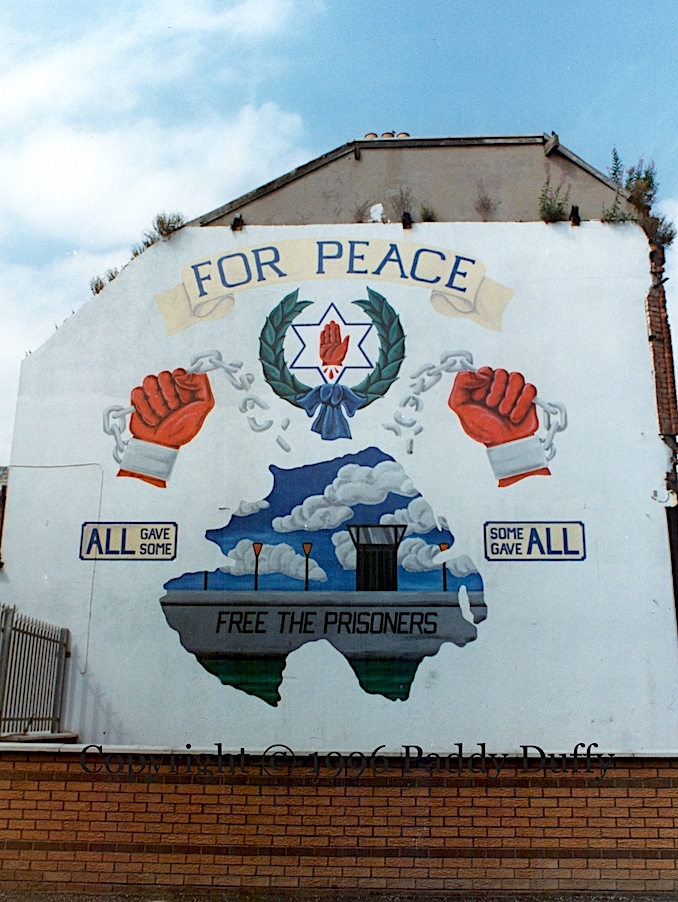 A pair of manacled red fists break free of their chains and the Maze/Long Kesh is depicted in the outline of Northern Ireland. “Free the prisoners”, “All gave some, some gave all.”