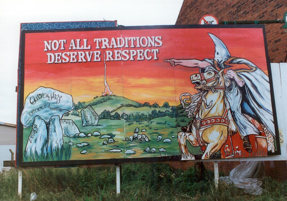 This Falls Road board is a comment on the “traditional routes” taken in Garvaghy (Portadown) and Ormeau (south Belfast) and other small towns (Enniskillen, Dunloy, Castlederg, Ros[s]lea, Keady, and Bellaghy) by the Orange Order – which now pass through CNR areas.