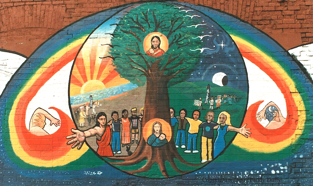 There is no text to accompany these images of sun/moon, day/night, and religious-icon-style figures in the branches and trunk of the central tree, but this is probably a mural from New Life church (web), between the security gates on Northumberland Street, west Belfast. The church is associated with Elim Pentecostal (web) and was founded in 1993 (old site).