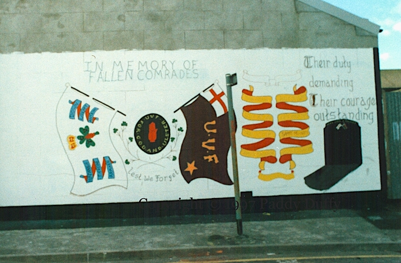 On the right, a UVF roll of honour: “In memory of fallen comrades. Lest we forget. John Hanna, Billy Millar, Noel Little, Bunter Davidson, Billy Stewart, Davy McNaught, Sammy Mehaffy, Dicky Richardson [later removed], Geordie Norris [later added]. Their duty demanding, their courage outstanding. Here lies a soldier, murdered by the enemies of Ulster.”