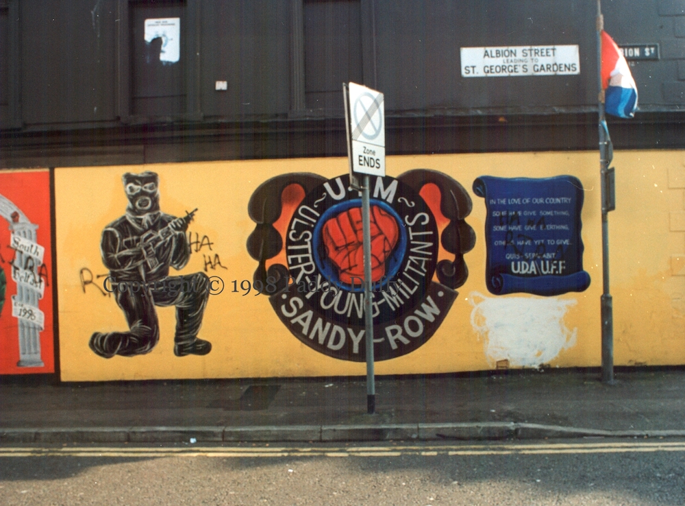 “In the love of our country, some have give[n] something, some have give[n] everything, others have yet to give. Quis separabit. UDA/UFF.” UYM mural with a crudely drawn hooded-gunman. There is “RIRA” graffiti in three places.