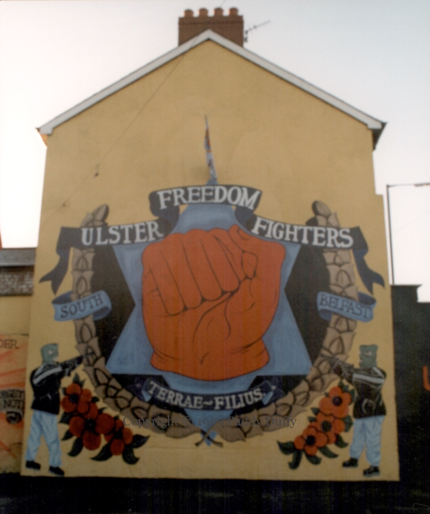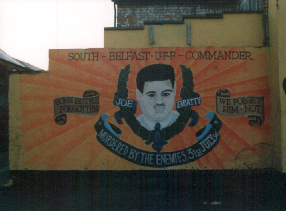 “South Belfast UFF commander Joe Bratty, murdered by the enemies, 31st July ’94.” Bratty was killed along with Raymond Elder by the Provisional IRA (WP). The pair were also remembered in a Lemberg Street mural in 2001, and later in the Sandy Row memorial garden.