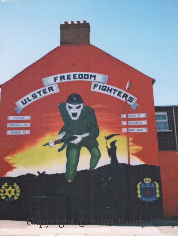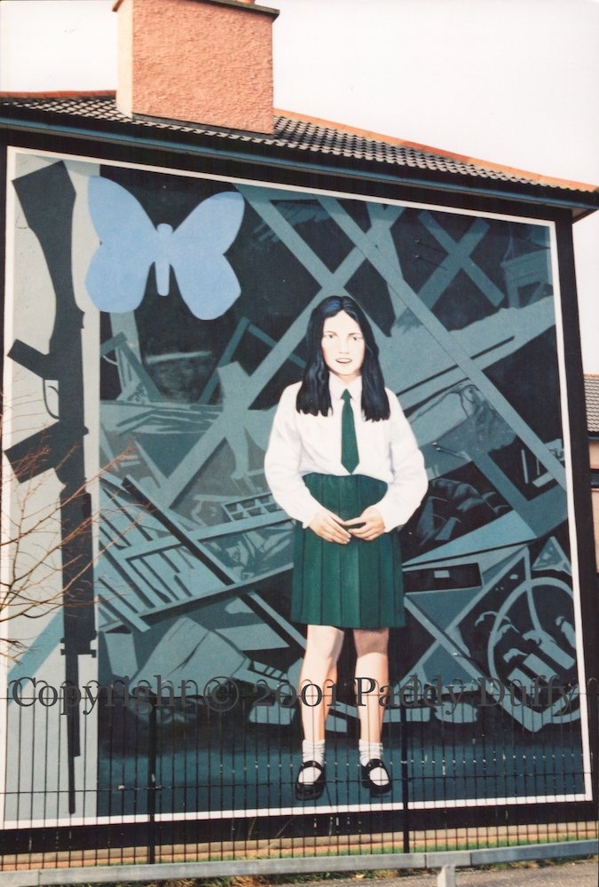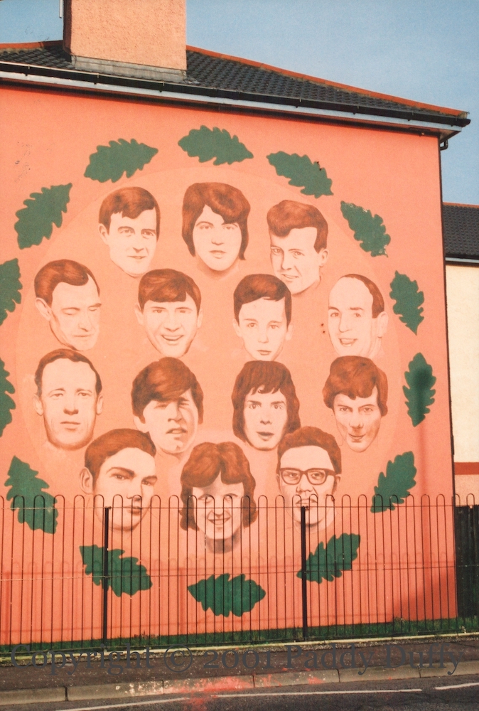 2001 Carousel Village Eddie —Tavanagh St, Belfast John Hanna pink —Broadway Belfast Village YCV —Broadway, Belfast Village UDA —Rockview St, Belfast In Loving Memory —Lemberg St, Belfast Michael Stone —Templemore Ave, Belfast Kieran Doherty –Slemish Way, Belfast Hunger Strikers —Lecky Rd, Derry Death Of Innocence —Lecky Rd, Derry Bloody Sunday Commemoration — Westland St, Derry Bernadette —Lecky Rd, Derry Hunger Strike —Rossville St, Derry LPOW — Ebrington Tce, Londonderry Cecil McKnight —Emerson St, Londonderry Waterside UVF —Dennet Gdns, Londonderry