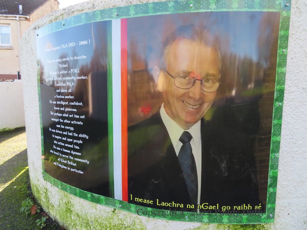 2022 West Belfast CNR (3) Carousel Rising Centenary —South Link, Belfast Seven Signatories —South Link, Belfast Rab McCullough —Owenvarragh Pk, Belfast Mol An Óige —Beechfield Pk, Belfast No Extradition —Springfield Pk, Belfast JFTC2 —Springfield Rd, Belfast New Barnsley Dead —Moyard Pk, Belfast New Barnsley Dead —Moyard Pk, Belfast Mná Na hÉireann —Rockmount St, Belfast Mná Na hÉireann + Connolly —Rockmount St, Belfast Hunger Strikers + Strip Searches — Rockmore St, Belfast Kieran Nugent —Rockville St, Belfast Patrick O’Connell —Whiterock Rd, Belfast Garden Of Remembrance —St James’s Cr, Belfast Garden Of Remembrance —St James’s Cr, Belfast Liggett/Brady —St James’s Cr, Belfast Battle Of The Falls —Northumberland St, Belfast Key 48 —Northumberland St, Belfast RNU Phoenix —Northumberland St, Belfast Eastát Ghleann Collainn —Glencolin, Belfast Cogús —Pantridge Rd, Dunmurry RNU + Mental Health —Pantridge Rd, Dunmurry Seán Keenan —Bell Steele Rd, Dunmurry Michael Ferguson —Bell Steele Rd, Dunmurry Patricia Black & Frankie Ryan —Bell Steele Rd, Dunmurry Memorial Garden —Bell Steele Rd, Dunmurry Fáilte Go Gleann Bán —Glenbawn Ave, Dunmurry Óglach Bobby Sands MP —Twinbrook Rd, Dunmurry Bobby Sands info —Twinbrook Rd, Dunmurry James McClean Gardenmore Rd, Dunmurry Celtic —Gardenmore Rd, Dunmurry Carol Ann Kelly/Beware Of A Risen People — Aspen PK, Dunmurry Grannies —Stanhope St, Belfast Grannies + Pepper Hill Steps —Stanhope St, Belfast Grannies —Stanhope St, Belfast Memories —Regent St, Belfast Michael Patrick Neill — Alton St, Belfast Louis Scullion —Alton St, Belfast Unlock Your Lockdown —Carrick Hill, Belfast Liú Lúnasa —Nansen St, Belfast Fáilte Feirste Thiar —Divis St, Belfast Marty John —Divis St, Belfast Black Lives Matter —Divis St, Belfast Political Policing —Divis St, Belfast End Internment —Divis St, Belfast Not Welcome —Divis St, Belfast 100 Years Of Partition —Divis St, Belfast To Live In The Hearts —Divis St, Belfast Coiste —Divis St, Belfast Fáilte Feirste [Thiar] —Divis St, Belfast [Fáilte Feirste] Thiar —Divis St, Belfast People & Places — Divis St, Belfast Fáilte Feirste Thiar plaque —Divis St, Belfast Pogrom — Divis St, Belfast ETUX —Conway St, Belfast Forging Our Heritage —Conway St, Belfast Casement Memorial —Conway St, Belfast Sinn Féin Australia —Conway St, Belfast Casement Support Group —Conway St, Belfast Spirit Of Freedom —Conway St, Belfast Eileen Hickey —Conway St, Belfast History Museum —Conway St, Belfast Oscar Romero —Conway St, Belfast The Sporting Wing —Falls Rd, Belfast