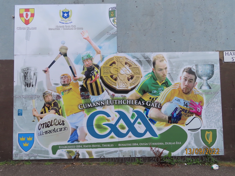The mural shown above celebrates (men’s) Gaelic games in County Antrim (tw) and at two local clubs: Naomh Gall (tw | web), founded in Clonard Street in 1910, and Naomh Pól (tw | Fb) in Hawthorn Street – the site of the mural – in 1941.