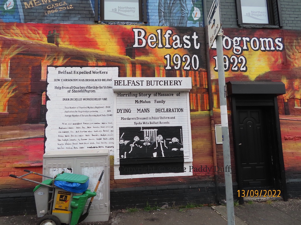 On July 12th, 1920, Edward Carson spoke to a crowd in Derry and, addressing the government in Westminster, said “if you are yourself unable to protect us from the machinations of Sınn Féın, and you won’t take our help; well, then, we tell you we will take the matter into our own hands.” (Treason Felony). Nine days later, the “clearings” of Catholics from Belfast shipyards and mills began, with about 5,700 Catholics and 1,850 socialists (“rotten Prods“) being expelled from Workman Clark and Harland & Wolff yards, and in total 10,000 workers from yards and mills over the next two weeks (History Ireland). In combination with the straitened economic circumstances of the time (post WWI) thousands (23,140 according to this mural, which reproduces a flyer derived from the Irish News of October 6th, 1920 – via The Irish Story’s account of the start of the “Belfast Pogrom”) were on relief.