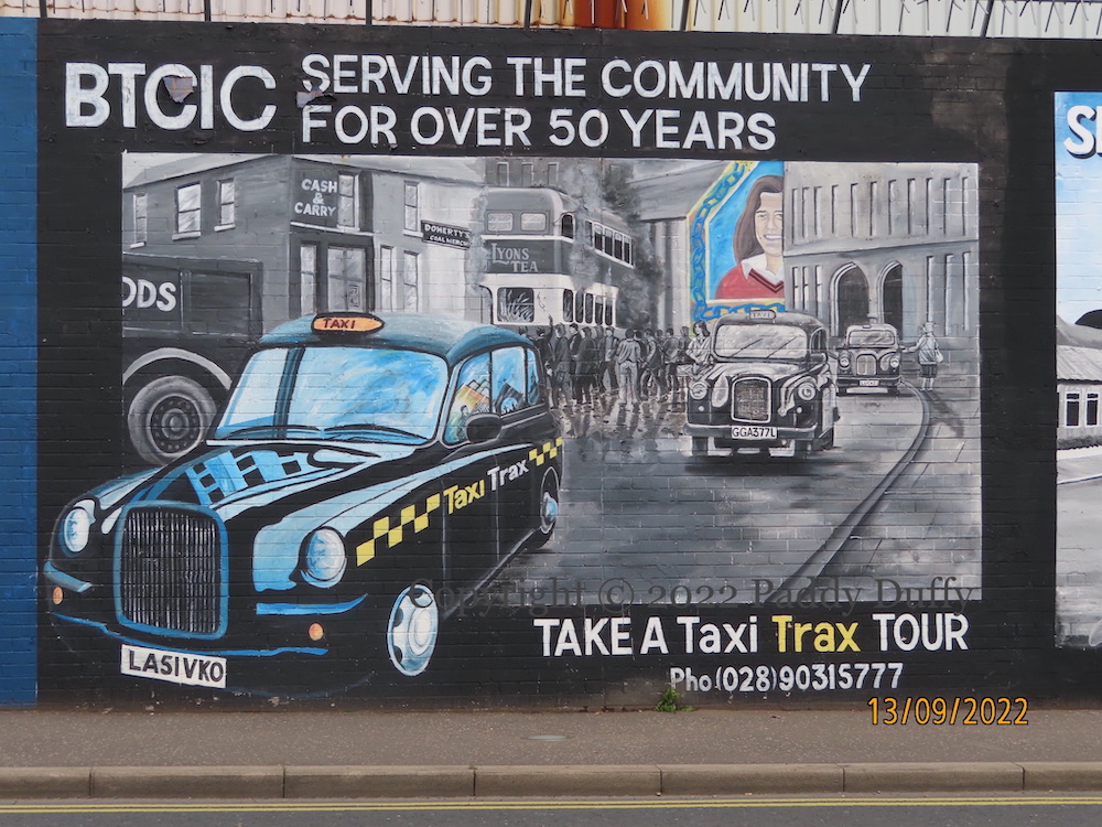 “Serving the community for over fifty years.” BTCIC is the current name for what was previously the West Belfast Taxi Association. Black taxis have been running up and down the Falls since 1970, providing an alternative form of transportation to local people during the Troubles when buses were cancelled or, as in this picture, burnt out and used as barricades. They now, in addition, provide tours of the murals (such as the Bobby Sands mural in Sevastopol Street) and Belfast city. Taxi Trax has a web site but here provides a phone number for those already at the International Wall, where there has been a black taxi mural since 2003. There are other WBTA murals in Beechmount and Ardoyne. The painters have signed the mural: Doherty’s Coal Merchant and Lyons Tea.