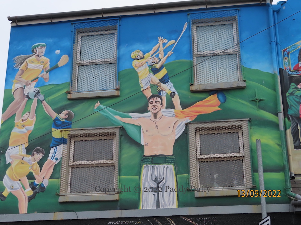 “Welcome to West Belfast.” The sights of nationalist west Belfast are depicted in (part of) a new mural by Mickey Doherty and Marty Lyons on the side wall of the tourist office. From left to right: The (2015) Bobby Sands mural in Sevastopol Street, tourists being introduced to the IRA D Company memorial garden on the lower Falls by Peadar Whelan, Conway Mill, Divis tower, RISE at the bottom of Broadway (better known as the “Balls on the Falls”), the Falls library, the “international wall” in 2012 (with marchers in support of a nondescript international cause, crocodiles for the Irish language, and gay rights), St Peter’s pro-cathedral, a black taxi, the Connolly statue outside Comhaırle Phobaıl an bhFál, and the model for the new Casement Park stadium.