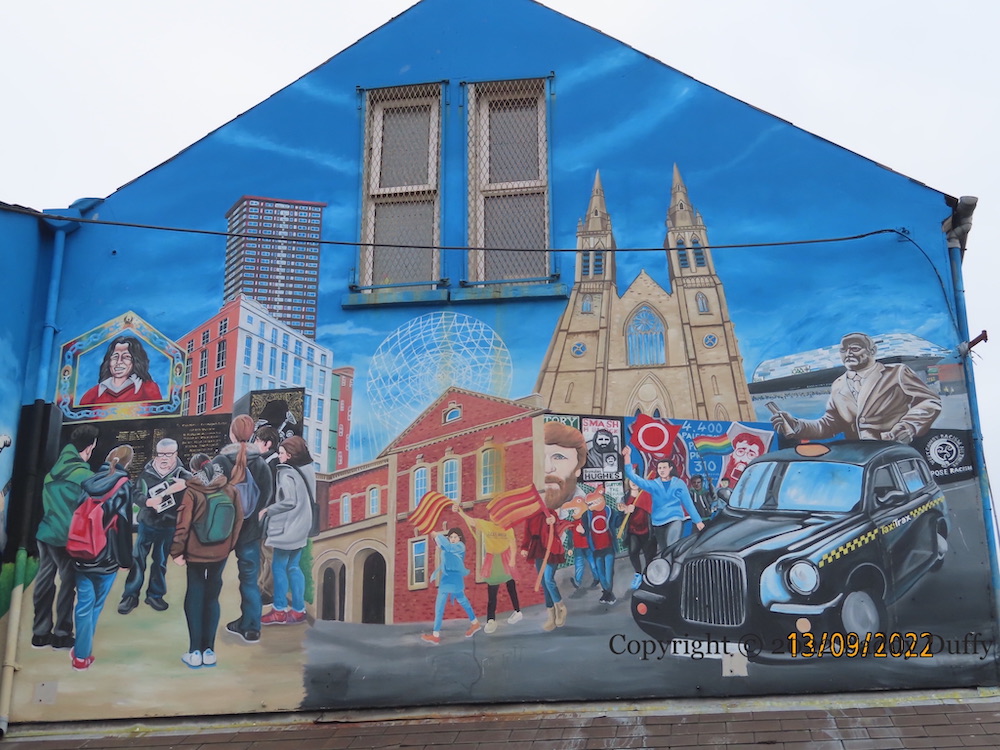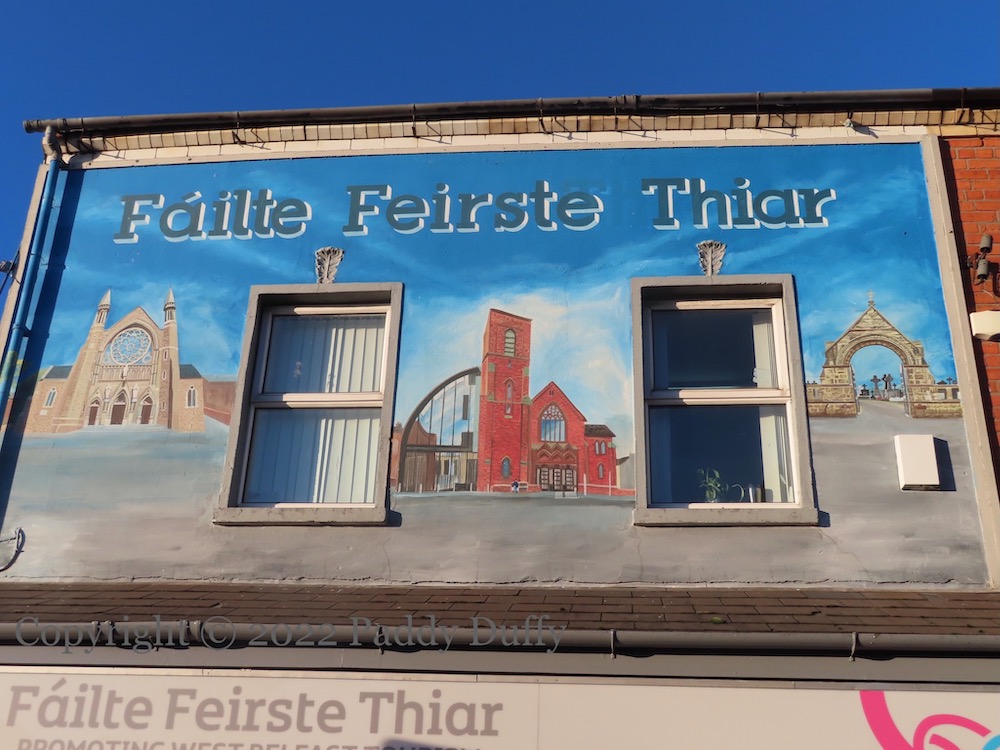 “Welcome to West Belfast.” The sights of nationalist west Belfast are depicted in (part of) a new mural by Mickey Doherty and Marty Lyons on the side wall of the tourist office. From left to right: The (2015) Bobby Sands mural in Sevastopol Street, tourists being introduced to the IRA D Company memorial garden on the lower Falls by Peadar Whelan, Conway Mill, Divis tower, RISE at the bottom of Broadway (better known as the “Balls on the Falls”), the Falls library, the “international wall” in 2012 (with marchers in support of a nondescript international cause, crocodiles for the Irish language, and gay rights), St Peter’s pro-cathedral, a black taxi, the Connolly statue outside Comhaırle Phobaıl an bhFál, and the model for the new Casement Park stadium.