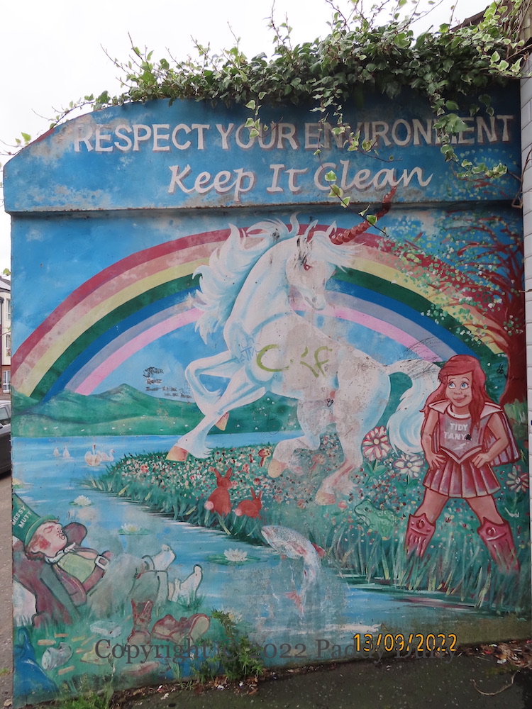 “Keep it clean.” “Tidy Tanya” in pink stands guard over the nature on the right side of the riverbank, protecting it from “Messy Mutt” who lies sleeping amongst rubbish on the left bank.