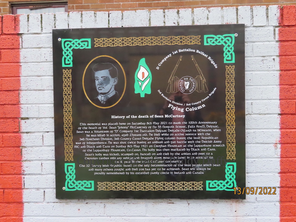 “History of the death of Sean McCartney. This memorial was placed here on Saturday 8th May 2021 to mark the 100th anniversary of the death of Vol Sean “Johnny” McCartney of no. 55 Norfolk Street, Falls Road, Belfast. Sean was a volunteer of “D” Company 1st battalion Belfast Brigade Oglaigh na hEireann, when he was killed in action, aged 23 years old. He died while on active service with the 3rd Northern Division, 3rd County Cavan Brigade flying column during the Irish Republican War of Independence. He was shot twice during an ambush and gun battle with the British Army RIC and Black and Tans on Sunday 8th May 1921 on Croghan Mountain at the Lappanbane stretch of the Lappanduff Mountain, Co. Cavan. His body was then mutilated by the Black and Tans. Sean’s body was kicked, stamped on, danced on and tied by the ankles and feet to a Crossley Tender military vehicle and dragged along mountain lanes in an attempt to instill fear in the local Co. Cavan community. The 32 county Irish republic based on the self determination of the Irish people which Sean and many others fought and died for has yet to be achieved. Sean will always be proudly remembered by his extended family circle in Ireland and Canada.” McCartney is buried in Milltown cemetery.