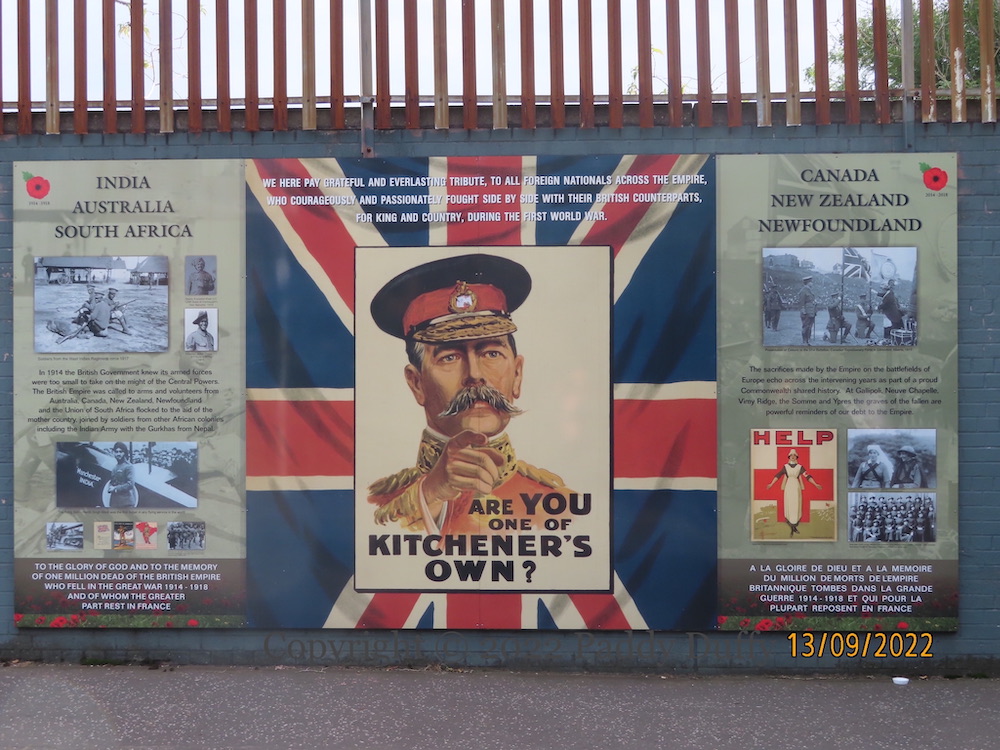 “Are you one of Kitchener’s own?” asks this mural in Northumberland Street: “We here pay grateful and everlasting tribute, to all foreign nationals across the empire, who courageously and passionately fought side by side with their British counterparts, for King and country, during the First World War.” The left-hand side (second image) features images of soldiers from the West Indies and India, including “The Flying Sikh”, Hardit Singh Malik and a French lady as she “pins flowers on a regiment containing Muslims, Sikhs, and Hindus.” On the right, images of the “presentation of Colours to the 51st Battalion Canadian expeditionary force” and of Canadian “bluebird” nurses in the Canadian Army Medical Corps.