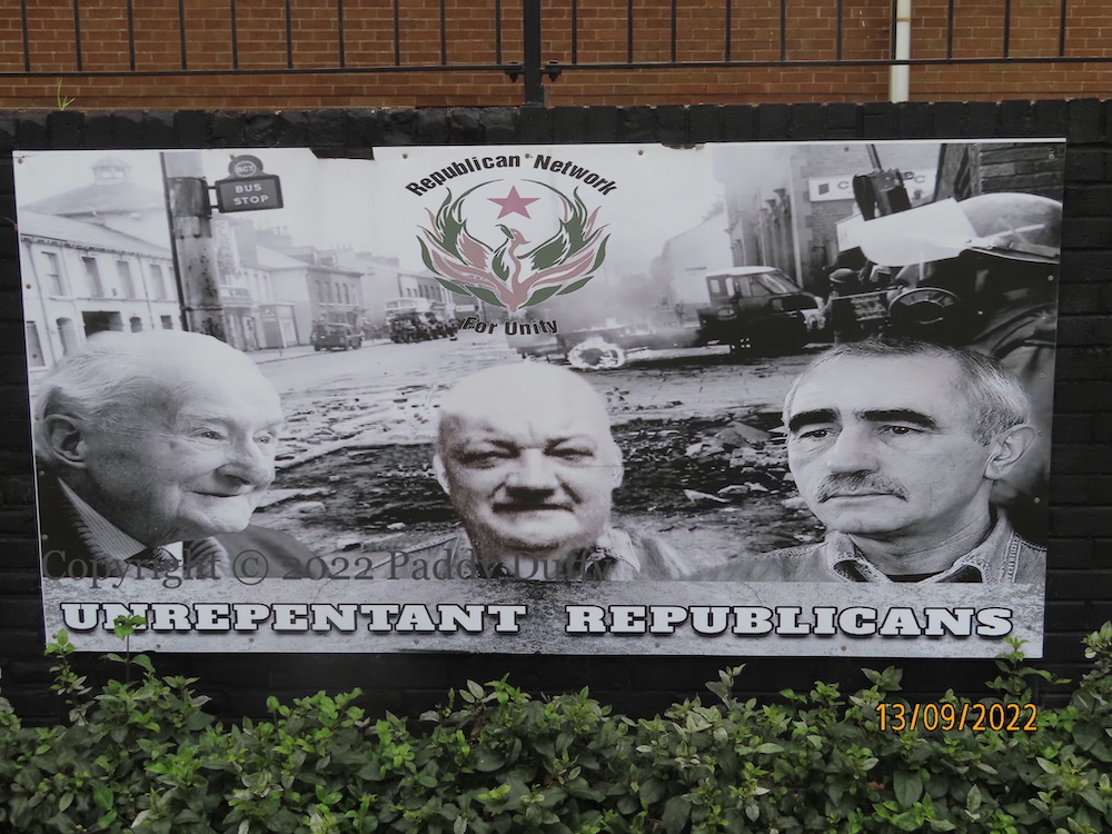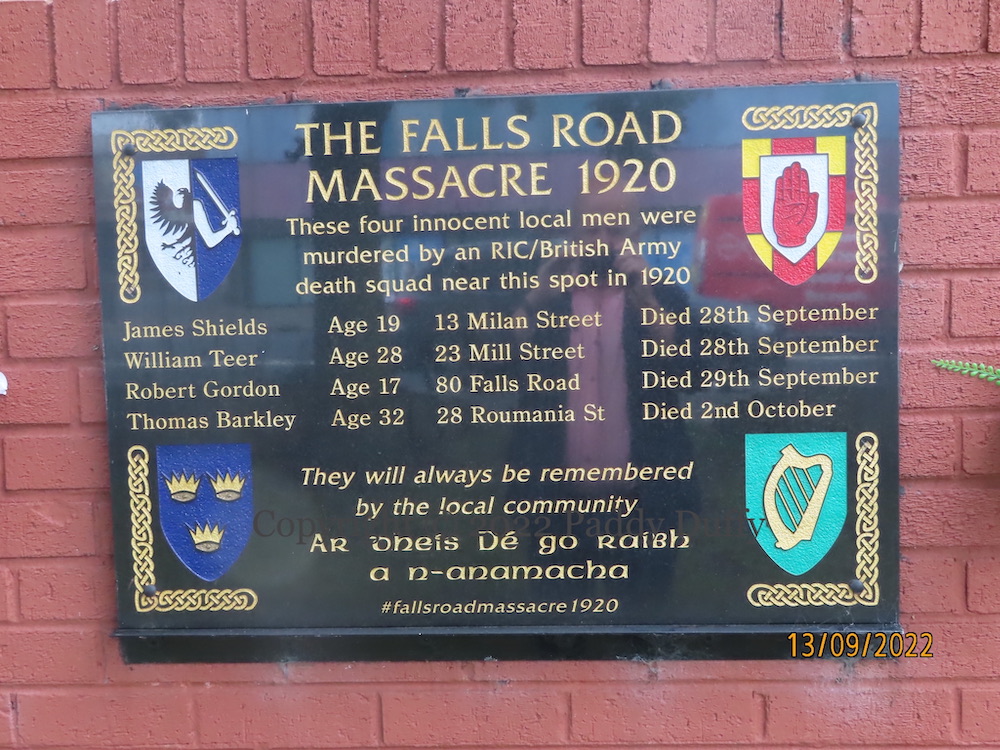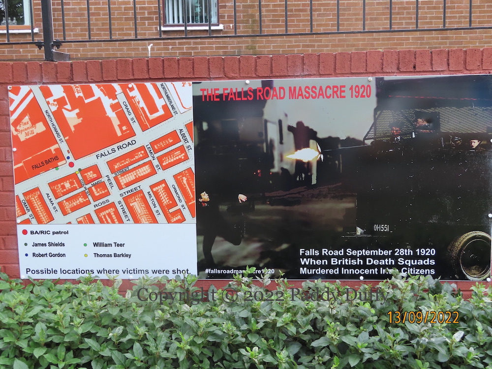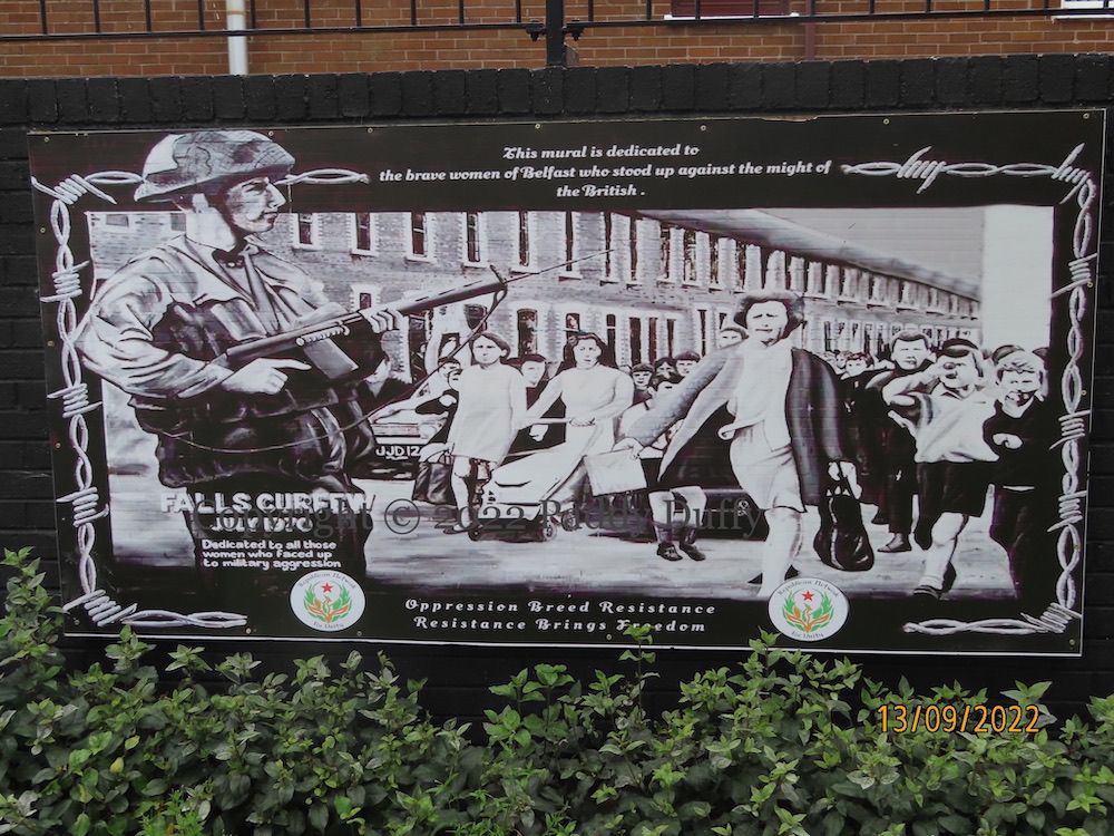Here is a gallery of the republican boards along the low wall just east of the Falls garden of remembrance. From right to left: James Connolly and Seamus Costello; Divis 81; anti-PSNI; “web of corruption”; Charlie Hughes (killed in 1971 the feud with the OIRA); the Falls Curfew featuring Máıre Drumm; Billy McKee, Alec Murphy, and Brendan Hughes; the Falls Road Massacre 1920; Kieran Abram – Abram was knocked to the ground in the early hours of July 5th, 1992, and kicked to death by loyalists in running battles with nationalists on North Howard Street, near the old British Army sangar. Four people were convicted of manslaughter in the case (Judiciary NI).