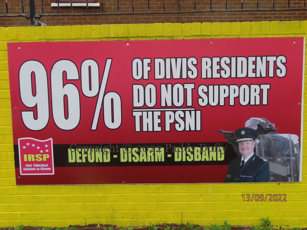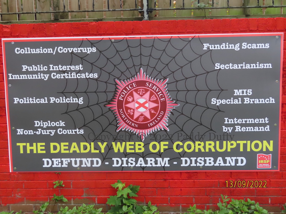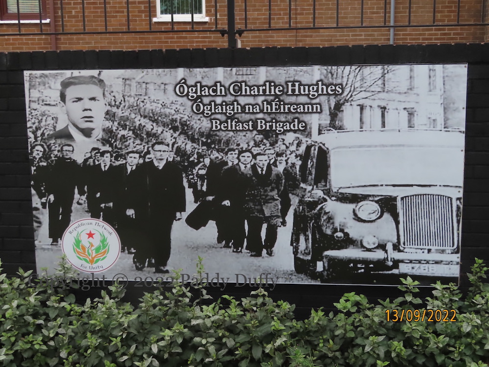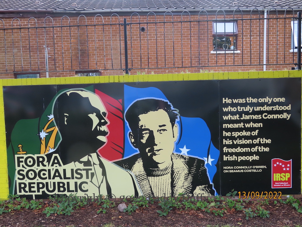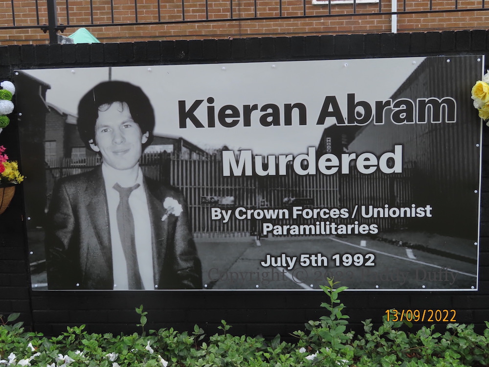 Here is a gallery of the republican boards along the low wall just east of the Falls garden of remembrance. From right to left: James Connolly and Seamus Costello; Divis 81; anti-PSNI; “web of corruption”; Charlie Hughes (killed in 1971 the feud with the OIRA); the Falls Curfew featuring Máıre Drumm; Billy McKee, Alec Murphy, and Brendan Hughes; the Falls Road Massacre 1920; Kieran Abram – Abram was knocked to the ground in the early hours of July 5th, 1992, and kicked to death by loyalists in running battles with nationalists on North Howard Street, near the old British Army sangar. Four people were convicted of manslaughter in the case (Judiciary NI).