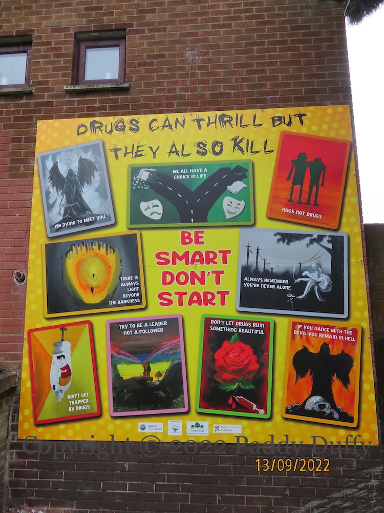 “Be smart, don’t start” – taking drugs, that is. This is a recent mural on the Falls Road, Belfast, with nine panels that discourage youth from taking drugs, alternately by reminding them of their dangers (including death – “Drugs can thrill but they also kill.” “I’m dying to meet you.” “If you dance with the devil you remain in hell.” “Don’t let drugs ruin something beautiful.” “Don’t get trapped by drugs.”) and providing support in persevering through dark times (“There is always light beyond the darkness.”