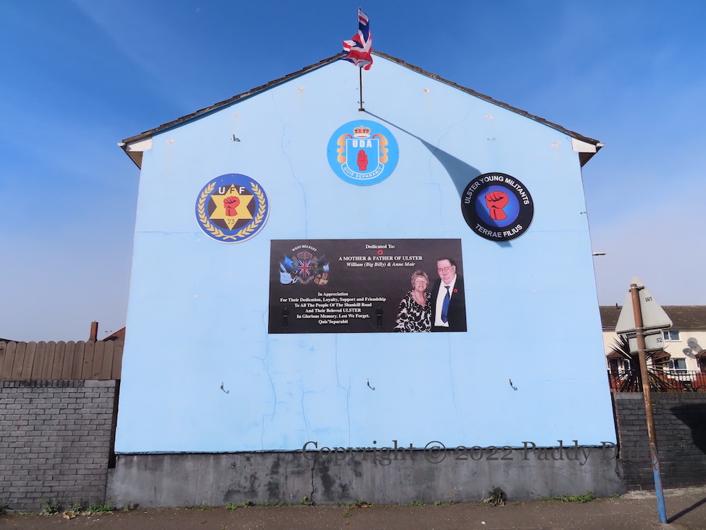 Billy Moir, who died in May 2016, was a central figure in the Glasgow flute-band scene. The board above, dedicated to Billy and his wife Anne, is in the lower Shankill estate. “Dedicated to a mother & father of Ulster: William (Big Billy) & Anne Moir, in appreciation for their Dedication, Loyalty, Support and Friendship to all the people of the Shankill Road and their beloved ULSTER. In Glorious Memory, Lest We Forget, Quis Separabit.”
