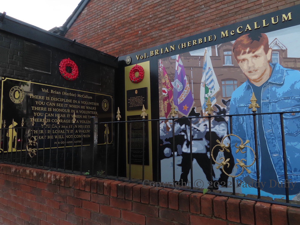 The long plaque reads: “June 1993 brought extreme Republican violence and agitation surrounding the annual Orange Whiterock parade, which was travelling its traditional route past this very spot and onto the Springfield Road. The threat being so severe to this community, the 1st Belfast Battalion Ulster Volunteer Force deployed several armed active service units. Herbie being Herbie was first to volunteer for duty. Realising the grenade he had been issued with had malfunctioned and giving absolutely no consideration for his own safety, he carried the device to a safe location, away from men, women and children. This one selfless act costs Herbie his life when the grenade detonated prematurely. Volunteer Brian “Herbie” McCallum died 29th June 1993. Sadly missed by his family friends and comrades. Rest easy soldier your duty is done. For God and Ulster.” McCallum died three days after the explosion.