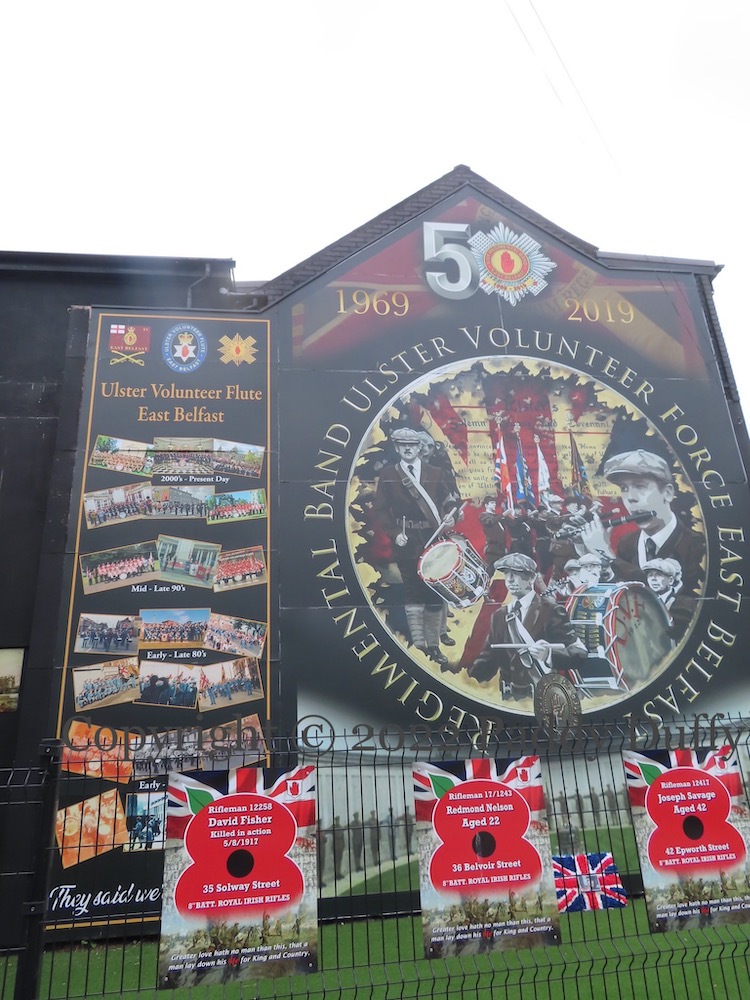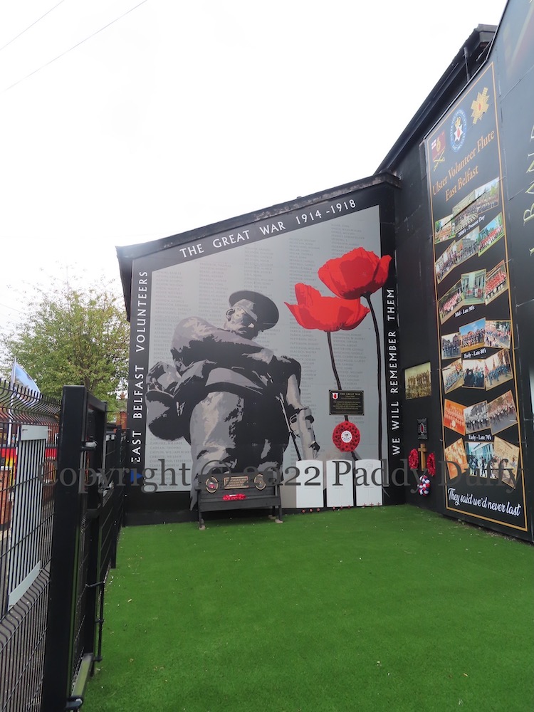 Ronnie’s hardware shop in east Belfast, vacant for many years and the site of Our Brave Defenders, was finally torn down last year and a pocket park created with murals commemorating east Belfast volunteers who died in the Great War and the UVF Regimental Band (tw), this year celebrating its 50 anniversary (video of the launch). See previously: 40th anniversary banner at the same spot (Belvoir Bar).