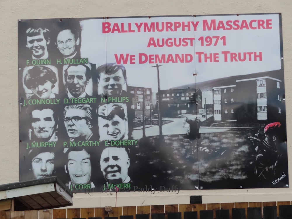 The plaque on the fence reads, “This plaque is dedicated to the 11 innocent civilians murdered by members of the British Parachute regiment in August 1971. Fr Hugh Mullan, Frank Quinn, Noel Phillips, Joan Connolly,