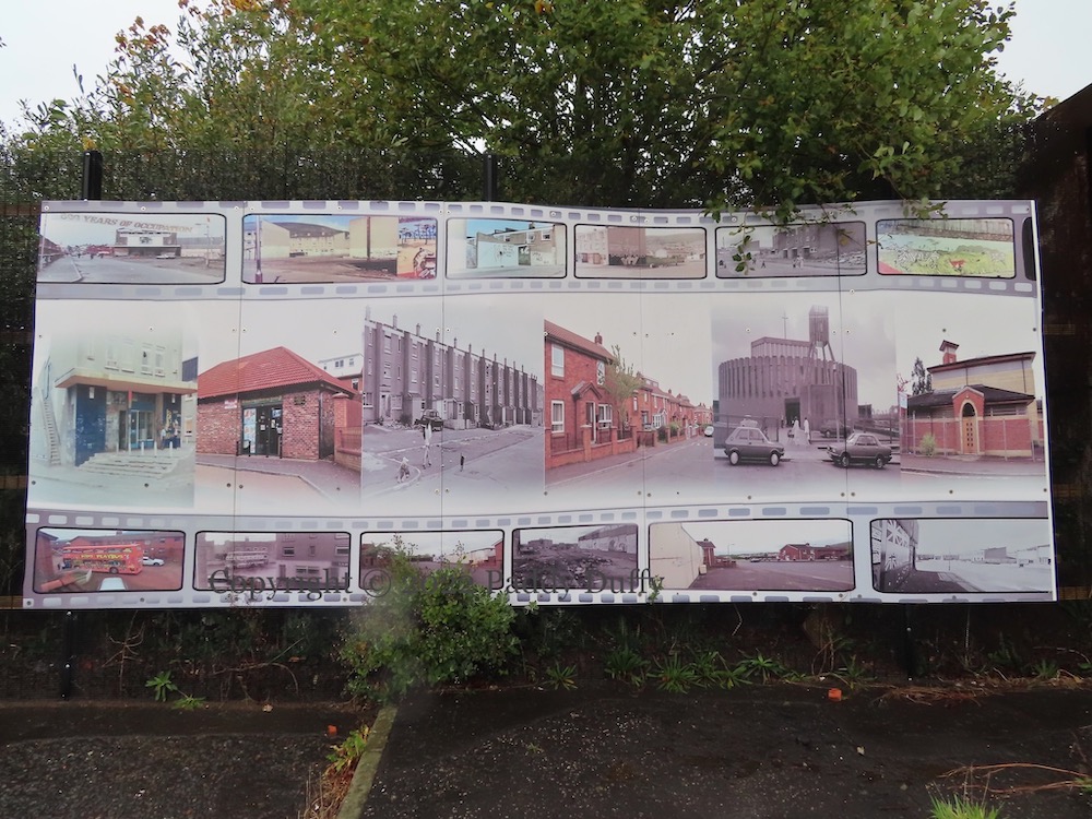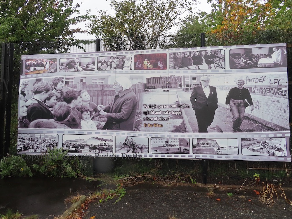 The wall at the top of Springhill Avenue was knocked down to great acclaim in 2017 (Guardian) but the impact was merely cosmetic as a wire fence and substantial shrubbery continued to block the way. The removal of the wall also meant the removal of the pro-Palestinian murals painted on it: Palestine Abú | Man Against Machine | Hellfire. In its place a large board was put in place celebrating the history of the area and especially the contribution made by Des Wilson and Noelle Ryan who worked in Springhill House for over forty years. Both Des and Noelle were interviewed by NVTv in 2012. Noelle died in 2014 (An Phoblacht) and Des in November 2019
