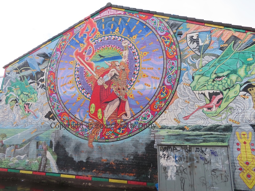 Gerard ‘Mo Chara’ Kelly first painted a mural of King Nuada in 1987, a year after being released from Long Kesh. He reproduced an illustration by Jim Fitzpatrick on a gable wall in Springhill (see images from 1987 | 1988 | 1989). This post-peace version is on the side-wall of the Whiterock Road Spar and was painted as statement of Kelly’s own rebirth after ceasing to work with funding agencies such as the Upper Springfield Development Trust.