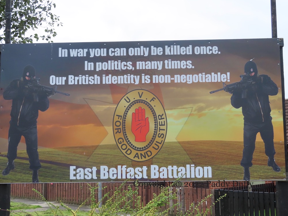 “[Politics is almost as exciting as war, and quite as dangerous.] In war you can only be killed once. In politics, many times. [ – Winston Churchill, 1903] Our British identity is non-negotiable! UVF East Belfast Battalion.” Hooded UVF volunteers are shown in active poses (as compared to the cradled rifles in The Erosion Of Our Identity) ready to resist any compromise in the still-unresolved tension between Brexit and the Belfast (Good Friday) Agreement of 1998.