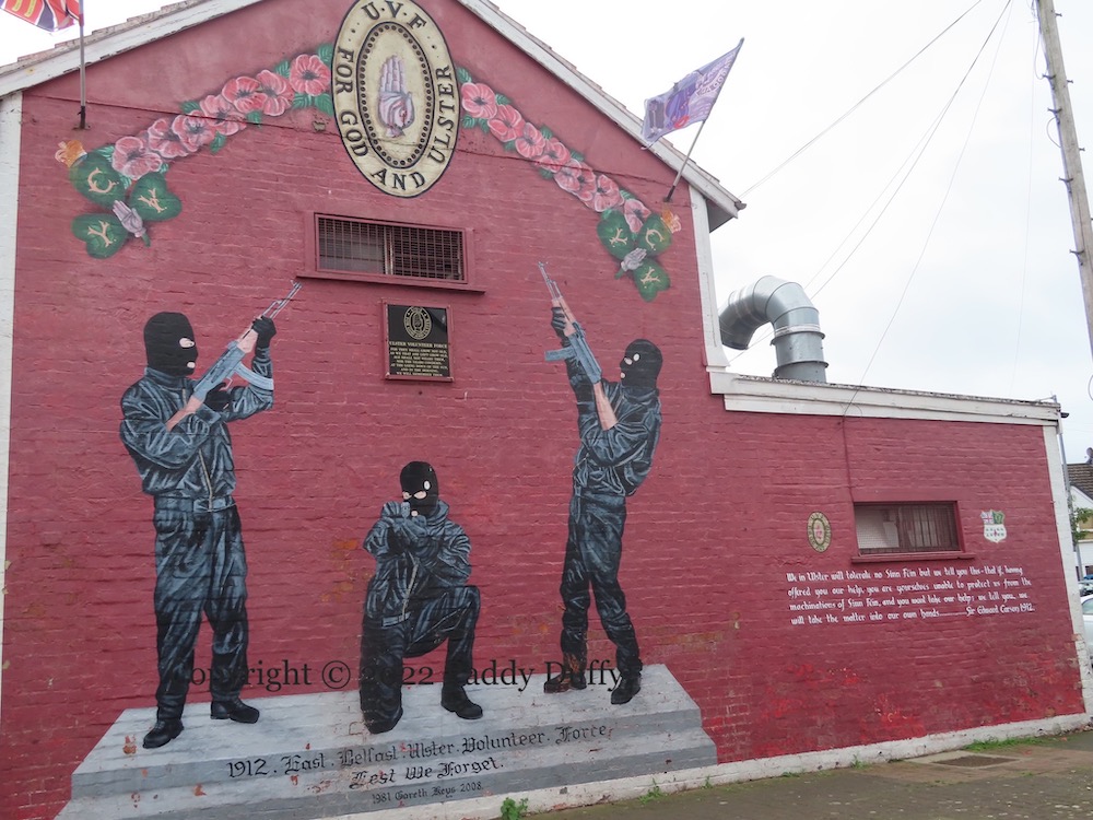 “We in Ulster will tolerate no Sinn Féin but we tell you this – that if, having offered you our help, you are yourselves unable to protect us from the machinations of Sinn Féin, and you won’t take our help; we tell you, we will take the matter into our own hands …. ” A quote from Sir Edward Carson (probably, 12th of July, 1920 rather than 1912 – Treason Felony | RTÉ) replaces the previous “free men” quote (see M03378); the poppies between the emblems in the main panel are also new, as is the plinth the hooded gunmen are standing on, which reads “1912 East Belfast Ulster Volunteer Force” (also, “1981 Gareth Keys 2008″). In other words, the mural has been softened (slightly) by adding historical elements.