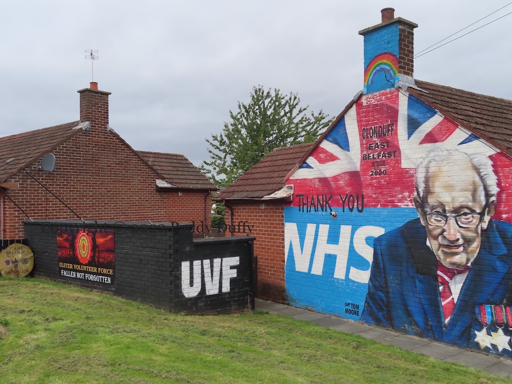 The civic spirit of Bedfordshire’s Captain Tom Moore has been celebrated in murals across the UK, including this one by Blaze FX in Clonduff. Moore attempted to raise funds for the NHS during covid by doing laps around his garden with his walker in advance of his hundredth birthday. He originally aimed at raising 1,000 pounds but ended up raising 30 million after the effort went viral.