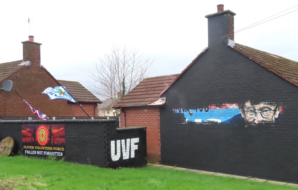 On the left is a tree cross-section (or “tree disk”) (on the left) that has been decorated with a hooded gunman and the insignia of the (east Belfast) UVF and YCV, along with a printed board with “The uniform may have changed but the cause remains the same. Ulster Volunteer Force” around the UVF emblem and “Fallen, not forgotten” below. There is a very close variant of this wording on a mural in Bowtown (Newtownards).
