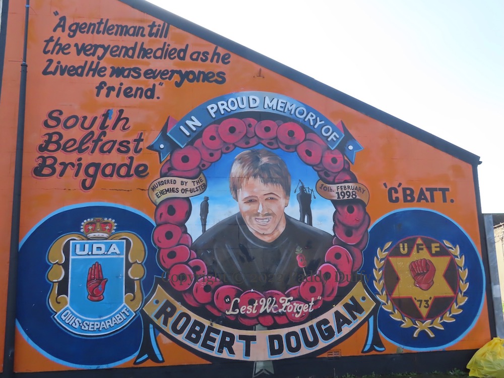 South Belfast UDA commander Robert Dougan killed by the IRA on February 10th, 1998 while sitting in a car outside Balmoral Textiles in Dunmurry, two months before the Good Friday Agreement was signed. Ed Maloney summed up the situation at the time in a Sunday Tribune article. “A gentleman till the very end, he died as he lived, he was everyone’s friend.”