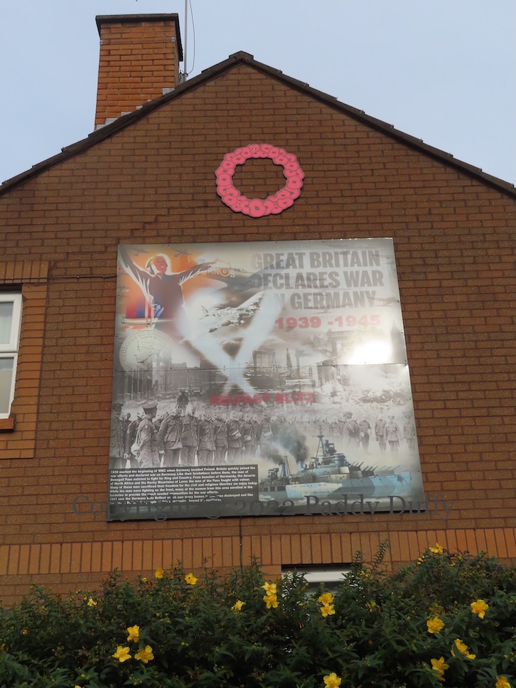 Above: “Great Britain declares war on Germany 1939-1945. 1939 marked the beginning of WW2 when Germany invaded Poland. Britain quickly joined the war efforts and declared war on Germany. Like their forefathers before them, the men of Donegall Pass enlisted to fight for King and Country. From beaches of Normandy, the deserts of North Africa and the Rocky Mountains of Leros the men of the Pass fought with valour. Many of these men sacrificed their freedom for the civil and religious liberties we enjoy today. While the men were fighting on the front, many of the women from this area enrolled in the factories to provide the much needed ammunition for the war efforts. 1941 saw the Germans Blitz Belfast which saw many homes in this area destroyed and like the rest of Belfast, the people of this community shows it’s [sic] resilience.”