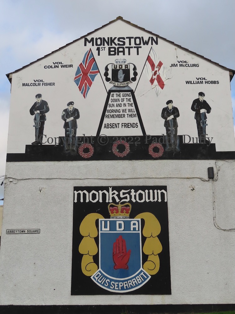 This Monkstown mural commemorates four UDA volunteers: Malcolm Fisher, Colin Weir, Jim McClurg and William Hobbs. Hobbs and McClurg were killed when a bomb went off prematurely (CAIN’s Sutton Index 1977) ; there is no mention of the other two. Please leave a comment or send an e-mail if you have any information.