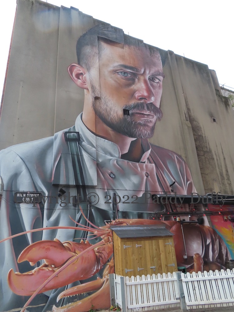 The lobster street art by Glasgow-based SMUG (ig) is unfortunately being impinged upon by lights, fencing, and a shed belonging to the Ulster Sports Club.