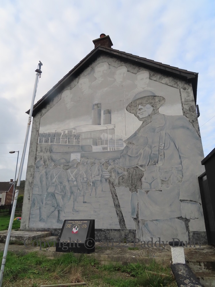A memorial stone has been added to the fading mural of soldiers of the 15th battalion heading to France in 1915, beginning a list of former members of the Rathcoole Friends Of The Somme (Fb). For the names of the five portraits, and the mural in better condition, see Many Did Not Return.