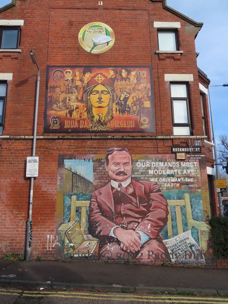 The wide shot (below) shows the James Connolly mural below and the 1916 centenary board above – also seen in South Link: Ag fíorú na poblachta/“Realising the republic”.