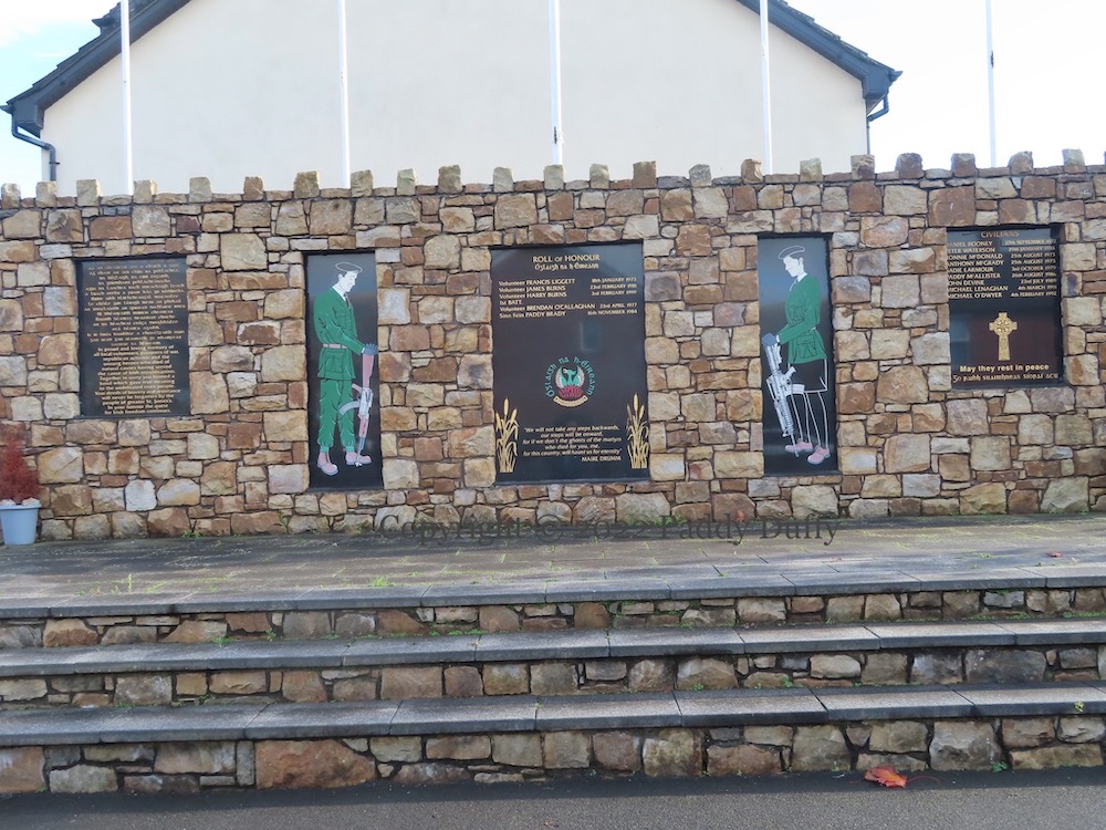 “In proud and loving memory of all local volunteers, prisoners of war, republican activists and the unsung heroes who died of natural causes having served the cause of Irish republicanism [“sean óglach” on the individual plaques]. Together in unity you formed a bond which gave true meaning to the undefeated risen people. Your deeds of bravery and resistance will never be forgotten by the people of greater St. James’s. In your honour the quest for Irish freedom continues.” With the famous “our steps will be onward” quote from Máıre Drumm at an anti-internment rally in Dunville Park on 10th August, 1975 (RN). Coıste Cuımhneacháın Lár Na bhFál/Ard Na bhFeá [Memorial committee of mid-Falls/Beechmount]. For some more of the plaques, see The Unsung Heroes.