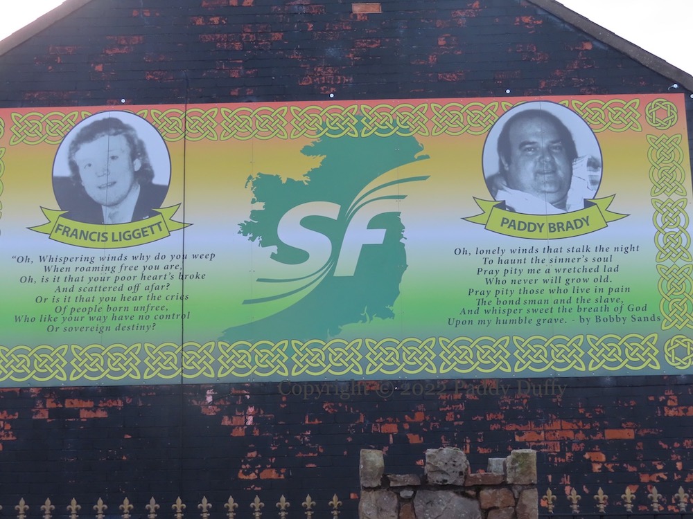 The board on the gable to the side shows Francis Liggett and Paddy Brady. IRA volunteer Francis Liggett was shot dead by the British Army during an attempted armed robbery at Royal Victoria Hospital, Falls Road in 1973 (Sutton) while local Sınn Féın member Paddy Brady was shot by the UFF while at work in 1984 (Sutton | An Phoblacht). They are commemorated in the St James memorial garden with the board shown above, featuring two verses from Bobby Sands’s poem Weeping Winds: Oh, Whispering [Whistling, in the original] winds why do you weep/When roaming free you are,