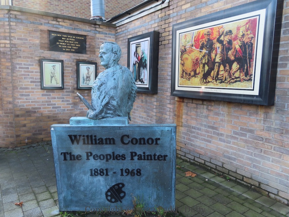 The info board describes his methods in capturing the Belfast street scenes for which he is most famous: “Conor was developing a spontaneous drawing technique by recording quick impressions, and it soon became a habit for him to go out into the streets with a newspaper, which contained loose leaves from his sketchbook. When he saw anything of interest he leant against a lap post or wall, took out his newspaper as though he were simply reading the sports results and sketched away.”