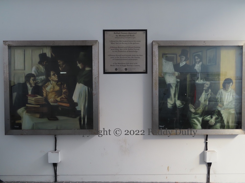 Four paintings by Michael O’Neill were added in 2008 to Warehouse Lane with the redevelopment of the Four Corners buildings (BBC) (at the junction of Waring Street and Donegall Street) depicting scenes from the history of the United Irishmen: Wolfe Tone and the Muddlers; Henry Joy McCracken goes to the gallows; Russell, Bunting, and Mary Ann McCracken; Russell with the first edition of the Northern Star.