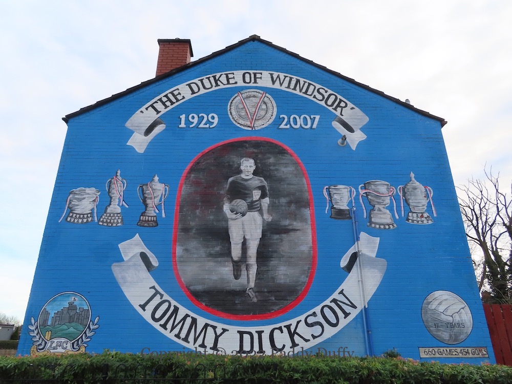 Tommy Dickson ended his career (in 1965) with a partial season at Glentoran. Before that, however, he spent 16 seasons in the first team at Linfield, scoring 451 goals and leading the club to titles in the League Cup, Irish Cup, Gold Cup, Ulster Cup, City Cup, North-South Cup, and County Antrim Shield (shown at the top of the mural). (WP)