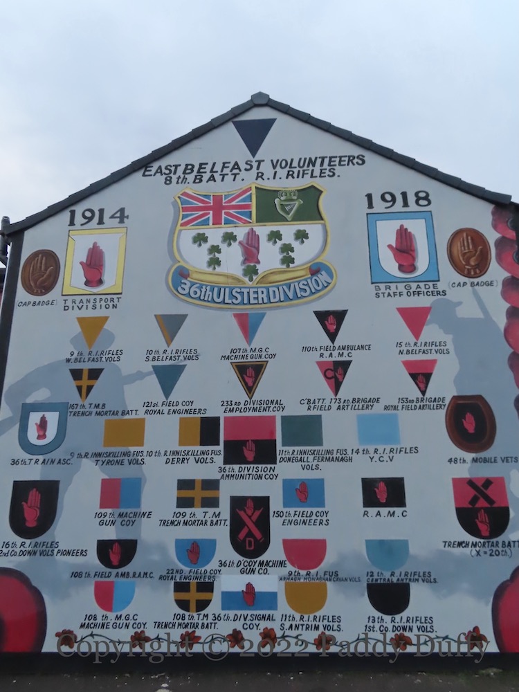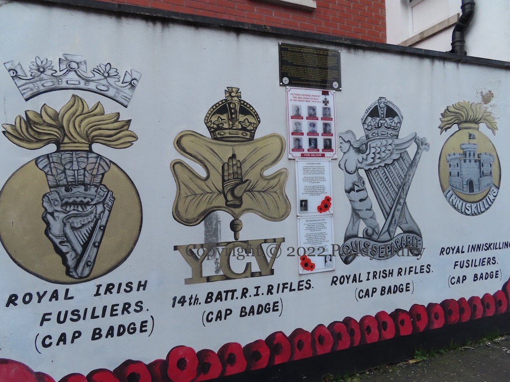 This mural and its accompanying plaques, at the mouth of Canada Street, commemorate WWI and celebrate the Victoria Crosses won by members of the 36th (Ulster) Division “For valour”: Cather, McFadzean, Bell, Quigg, Emerson, De Wind, Seaman, Knox, and Harvey. The main mural features insignia of more than thirty units of types ranging from machine gunners to vets.