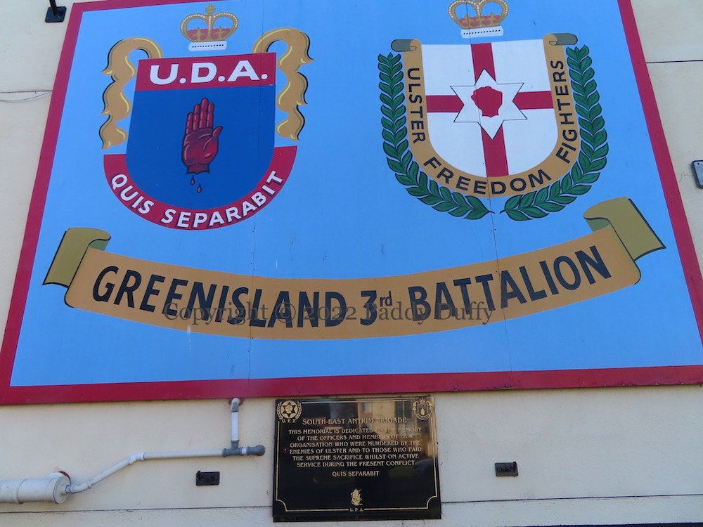 “Greenisland 3rd Battalion, South-East Antrim Brigade [UDA]. This memorial is dedicated to the memory of the officers and members of our organisation who were murdered by the enemies of Ulster and to those who paid the extreme sacrifice whilst on active service during the present conflict. Quis separabit. UFF. UDA, LPA”