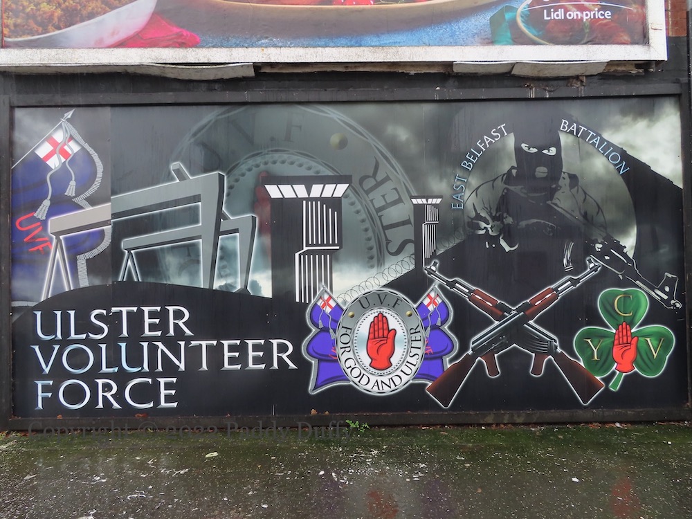 The previous UVF mural in Carrington Street (Volunteering | On Your Side) was paint-bombed in October, 2020, (Keep It Local) but was quickly replaced by this computer-generated board showing the Harland & Wolff cranes, a Long Kesh watch-tower, and a hooded gunman from the UVF’s East Belfast Battalion.
